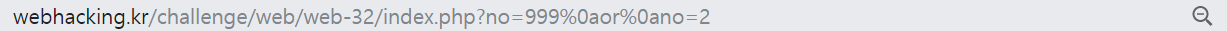 오 no=1일때 guest라는 것을 알았으니 webhacking.kr/challenge/web/web-32/index.php?no=999%0aor%0ano=2를 해보면 hi admin 이 나와 포인트 획득:)