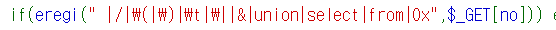 |(파이프)를 기준으로 /,&,union,select,from,0x 등의 문자열들을 필터링을 한다. 위와 같은 문자열을 이용하면 no hack이 출력된다.