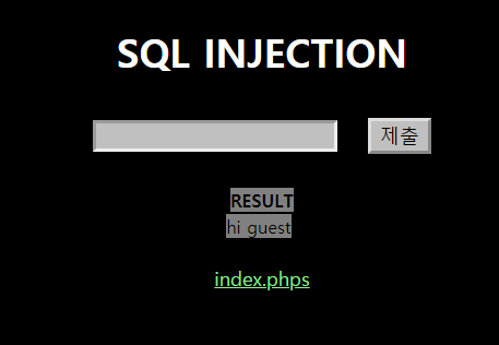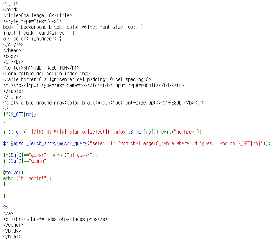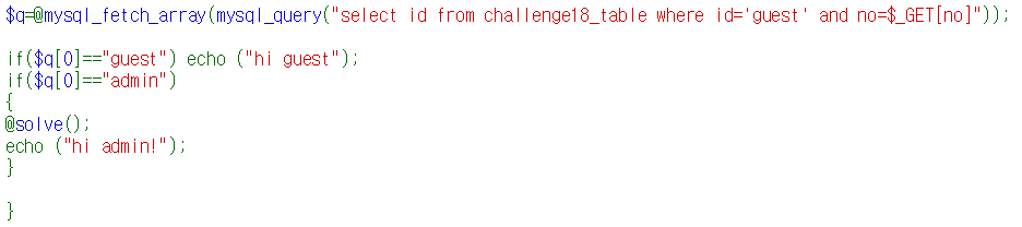 위의 코드는 변수 $q에 배열 형식으로 쿼리문을 저장한다. 위의 코드를 해석해보면 id='guest' and no=1 이면 hi guest 를 출력한다. and 는 둘다 참일 때 참이 되므로 admin을 출력하려면 id='guest' and no=1이아닌 아무런 값 or no=admin의 숫자 형식으로 넣어주면 될 거같다고 추측할 수 있다.