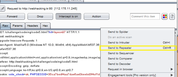 점수 올리기 위해 100번 반복해 주어야하므로 burp suite의 도구 중 repeater을 사용하겠다.