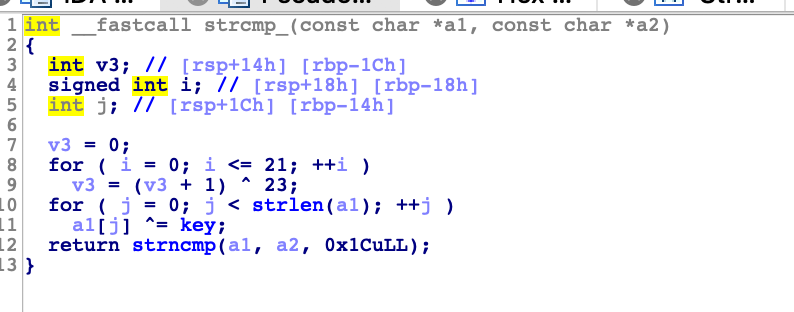 반복문이 2개가 있는데 2번 째 반복문을 보면 내가 입력한 값에 key를 xor연산 해준것을 a1배열에 넣어주어서 strncmp로 return 해준다.