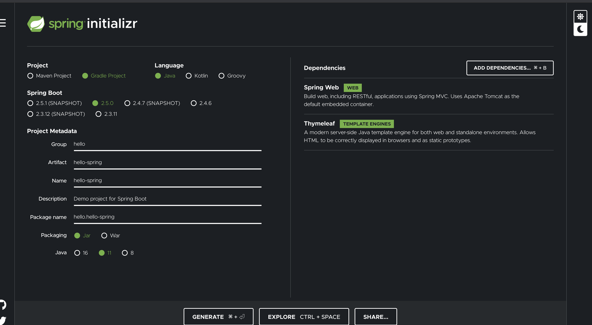 Dependencies는 spring web과 thymleaf를 설정해주었다.