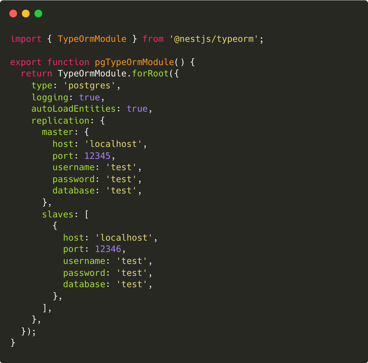 TypeOrmModule.forRoot에 replication 옵션을 활용하여 master, slaves 를 지정한다.